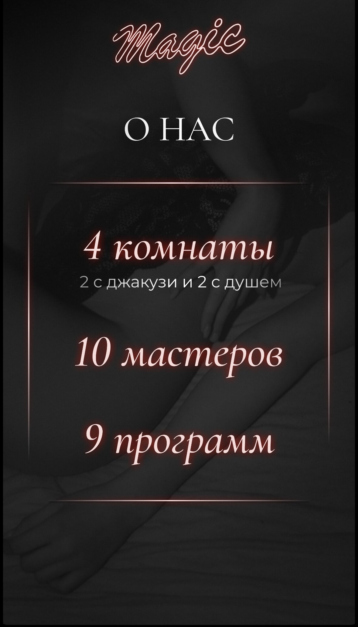 Салон эротического массажа Magic предлагает жителям Челябинска запоминающийся отдых, который позволит вам отвлечься от суеты и погрузиться в атмосферу удовольствия. Здесь вас ждут располагающий интерьер, тактичный персонал и достойное качество услуг, которые будут гарантией хорошо проведенного времени.